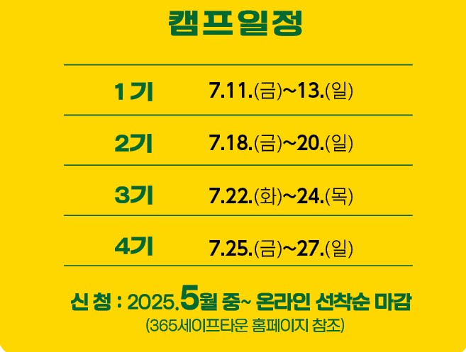 2025년 4월~6월 (정확한 일정 추후 공지) 캠프 참가 신청을 원하는 분들은 **강원소방본부 공식 홈페이지 및 SNS(유튜브, 인스타그램, 블로그)**를 통해 최신 정보를 확인하세요!